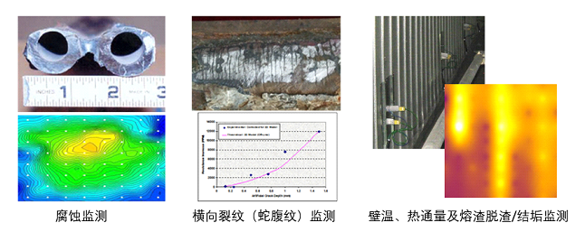 Based on the variable temperature resistance array scanning technology, the array sensor is installed on the back fire side of the water wall. The system collects the weak changes of current and potential caused by the thinning of the tube wall in the node matrix in real time. Meanwhile, the temperature of each node is collected and calculated by the matrix function. Real-time monitoring of large-scale corrosion of tube wall, circumferential crack growth, tube wall temperature, heat flux and slag desagging /scaling, effectively adjust boiler operating parameters and prevent tube burst.
