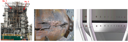 The austenitic stainless steel surfacing layer on the inner wall of hydrogenation reactor is prone to crack and spread to the matrix. Magnetic powder can not be operated, penetration can only detect surface opening defects, and can not evaluate the depth of crack growth, and grinding dust in closed space greatly damages detection personnel. FGI-3D technology is the best detection method, which can quickly scan the cracks on the surface and near the surface of the surfacing layer without grinding and can also evaluate the depth and length of the cracks.