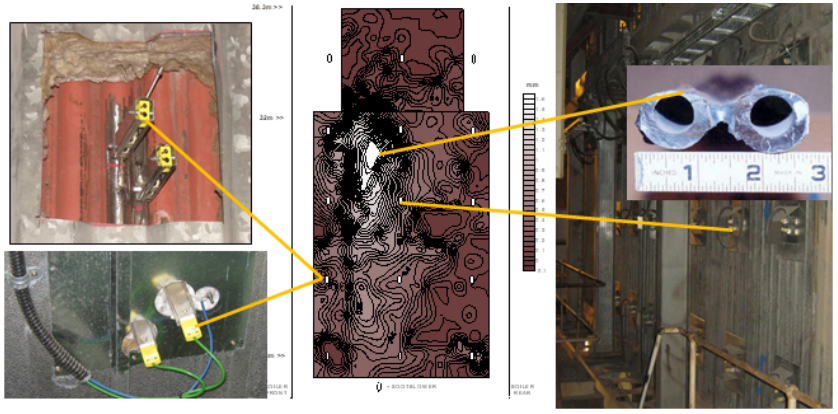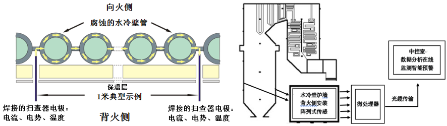 基于變溫電阻矩陣掃查技術(shù),陣列式傳感器安裝在水冷壁背火側(cè),系統(tǒng)實(shí)時(shí)采集節(jié)點(diǎn)矩陣內(nèi)因管壁減薄而引起的電流、電勢(shì)微弱變化,同時(shí)采集各節(jié)點(diǎn)溫度,通過(guò)矩陣函數(shù)推演計(jì)算,建立一套管壁重點(diǎn)區(qū)域的腐蝕速率、剩余壁厚和金屬壁溫、熱通量二維云圖。能夠監(jiān)測(cè)和控制爐壁溫度、熱循環(huán)、局部熱吸收/熱通量、向火側(cè)爐壁損耗、裸管區(qū)環(huán)向裂紋增長(zhǎng)及堆焊區(qū)裂紋增長(zhǎng)。