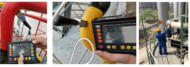 電磁超聲測厚儀可以在線不停機測量彎頭的殘余壁厚,無需打磨,無需去除油漆層,瞬時讀數(shù)。還可高溫650℃在線不停機測量。