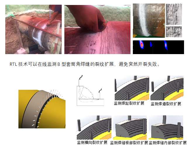 長輸油氣管道B型套筒角焊縫經(jīng)常出現(xiàn)延遲裂紋,但由于角焊縫結(jié)構(gòu)復(fù)雜,超聲和射線無法檢測,磁粉和滲透無法測量裂紋的深度。FGI技術(shù)可以節(jié)省打磨涂層的成本和時間,還可以測量 裂紋的深度和長度信息,為長輸管道的安全評估提供了有效依據(jù)。